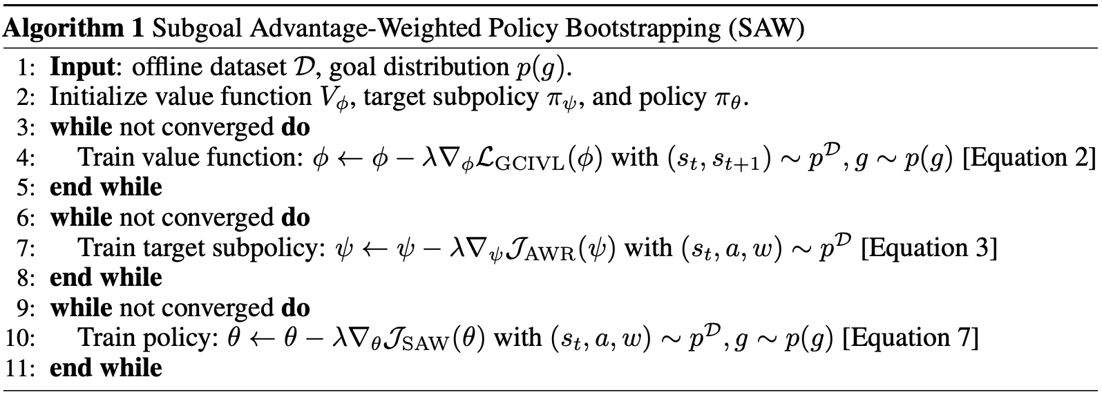 Our method, Subgoal Advantage-Weighted policy bootstrapping (SAW), combines two learning signals into a single objective: the one-step advantage signal from the goal-conditioned value function, and the subpolicy's estimate of the optimal action distribution for the a given subgoal. Rather than explicitly generate subgoals, we instead sample waypoints directly from the same trajectory as the initial state-action pair and weight the contribution of the KL divergence term by the optimality of that waypoint.