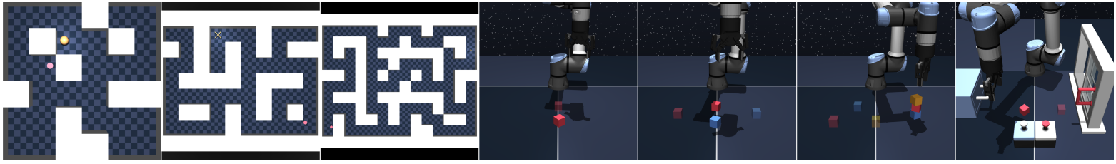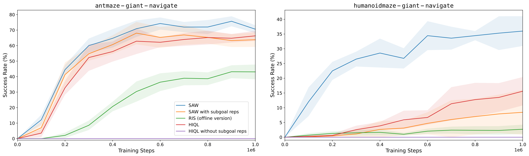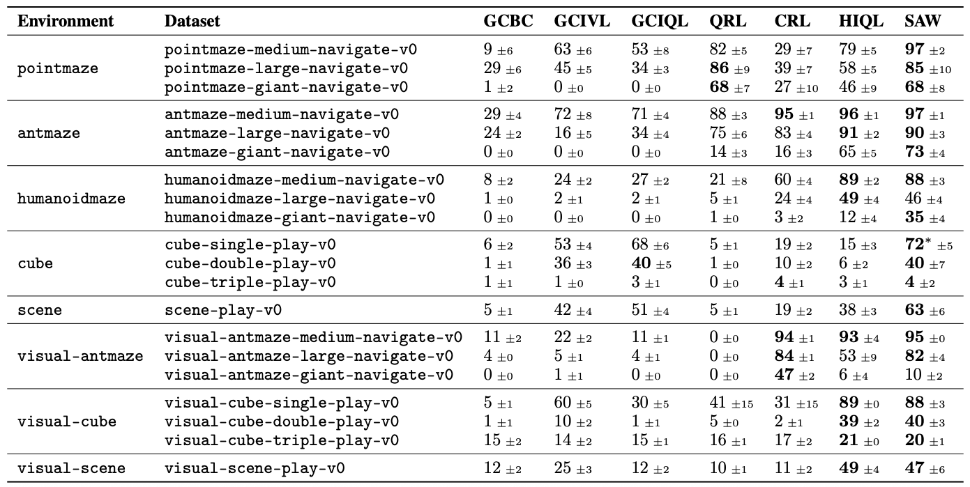 We evaluate SAW on a variety of locomotion and manipulation tasks from OGBench, showing state-of-the-art performance on nearly all tasks and outperforming hierarchical methods on the longest-horizon tasks: antmaze-giant-navigate-v0 and humanoidmaze-giant-navigate-v0 — being the first to achieve non-trivial performance on the latter!